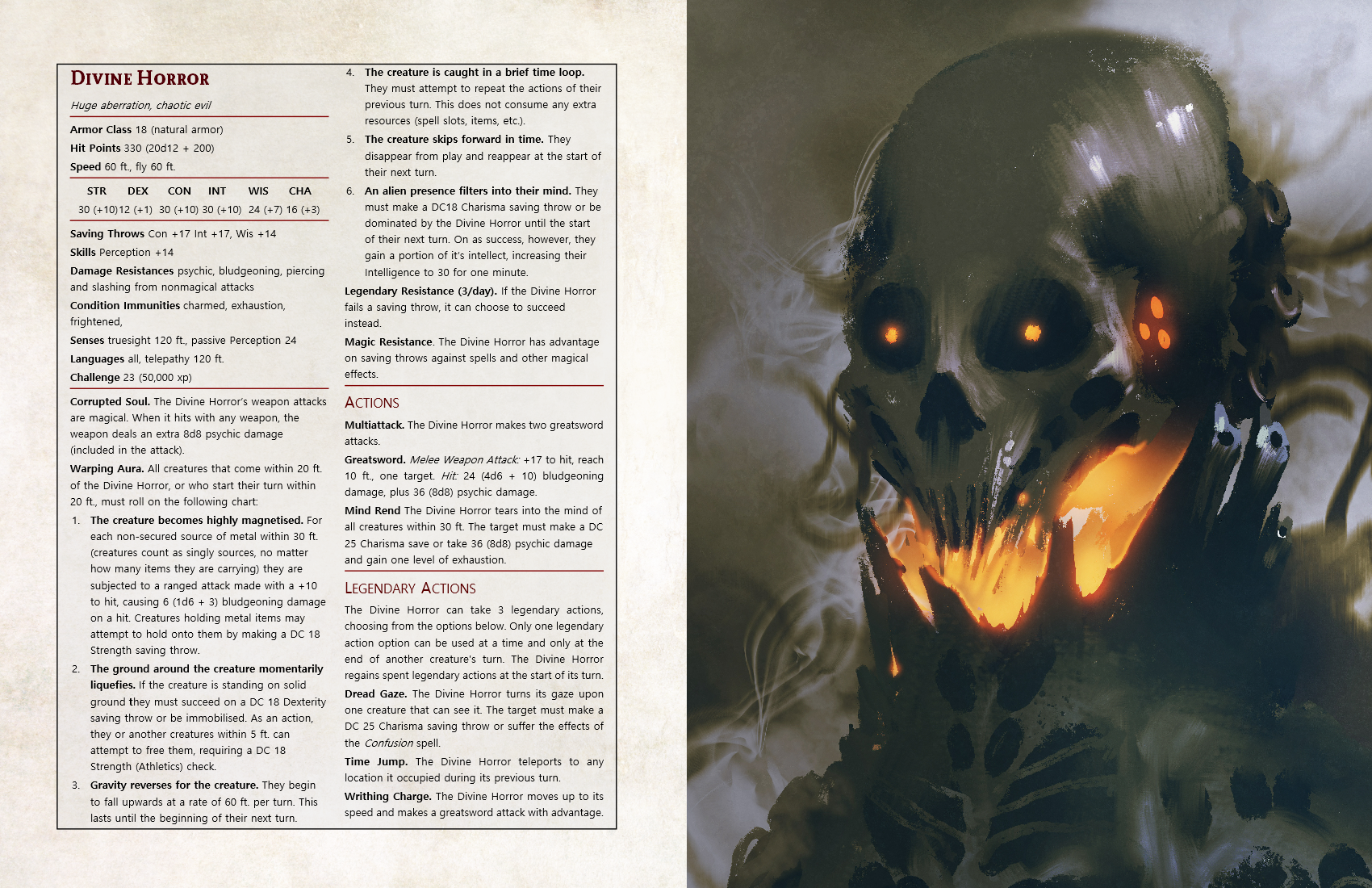 For most groups, the final encounter of the adventure will be the Divine Horror. This foul being combines the best – and worst – traits of powerful Celestials and dread Eldritch horrors.