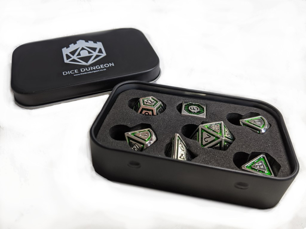 Fortunately for me, in recent days I’ve been given the perfect excuse to ditch the digital in favour of the physical, thanks to a package arriving from the folks over at The Dice Dungeon. The set they’d sent over was the rather beautiful Gaius The Green, an impressively sturdy collection of metal dice.